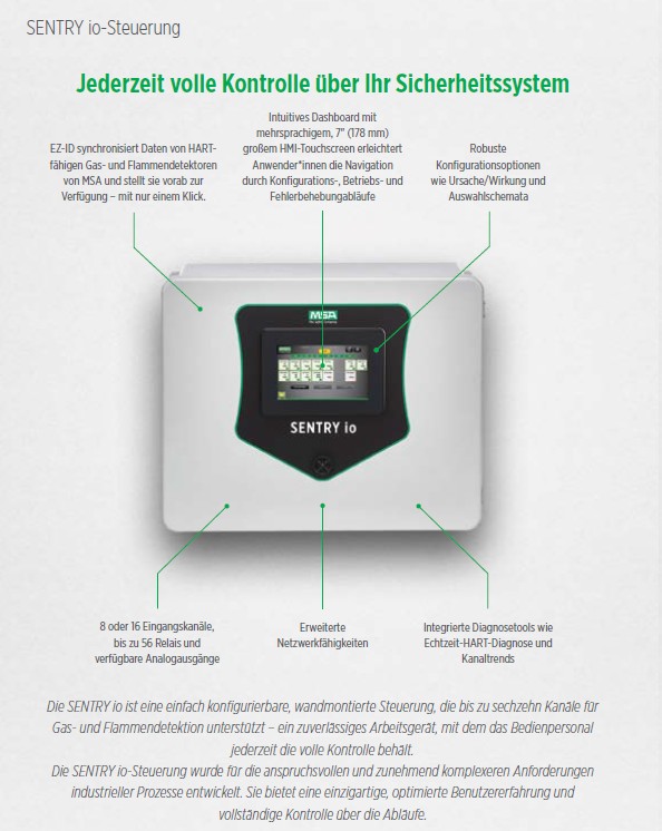 Die SENTRY io®-Steuerung stellt eine robuste, bedienfreundliche Plattform für nahezu jede Anwendung und jedes Qualifikationsniveau dar. Die moderne Touchscreen-Oberfläche ist intuitiv verständlich und erleichtert die Arbeitsabläufe bei der Einrichtung, Bedienung und Fehlerbehebung. Der Einrichtungsassistent und die automatische Erkennung der Flammen- und Gasdetektoren der Marken MSA und General Monitors® über HART sparen wertvolle Zeit bei der Einrichtung und Konfiguration.